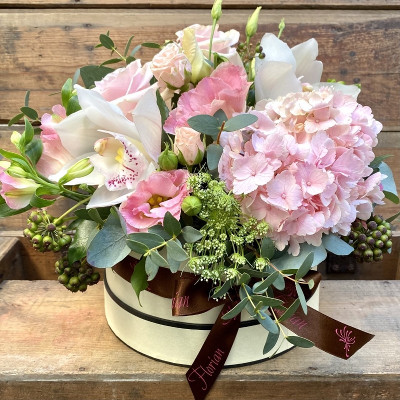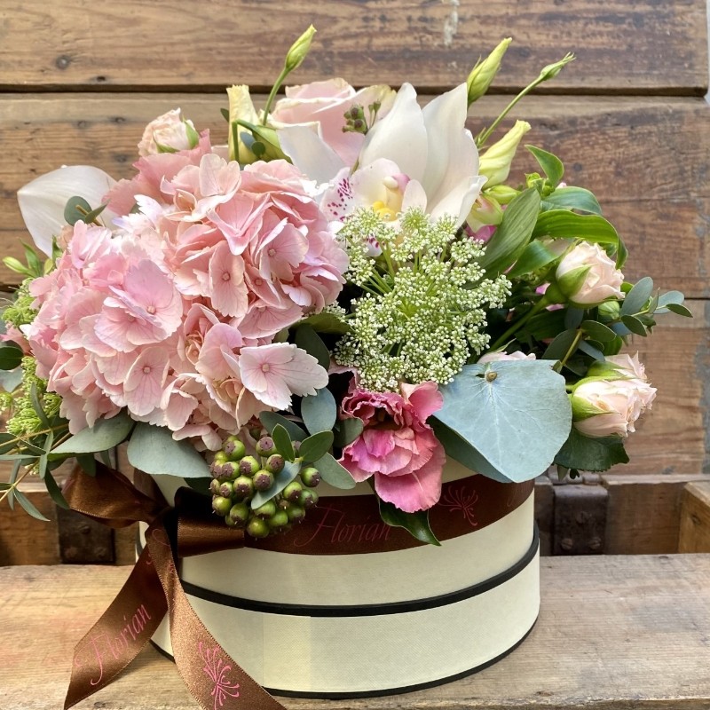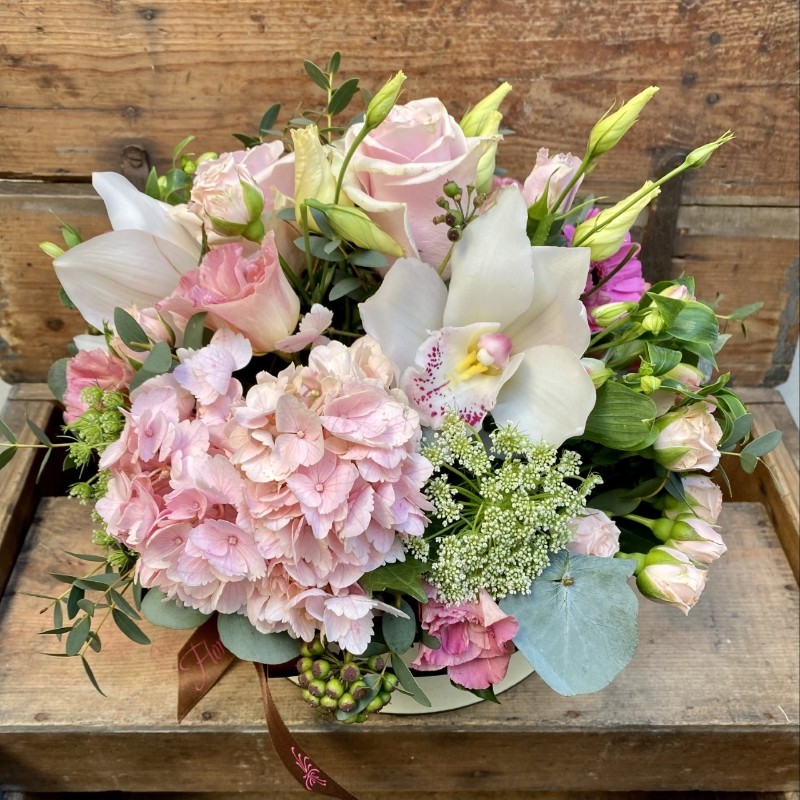 This pretty mix of Pastel flowers and foliage is beautifully designed into a lovely cream hat box.