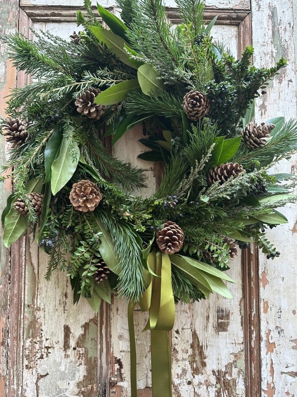 This simple elegant selection of foliages and cones is reminiscent of  winters walk  through the woods.