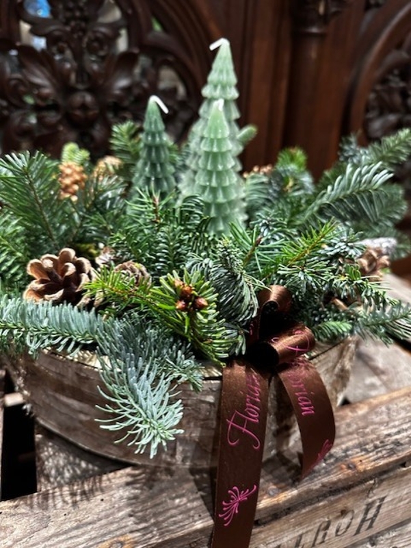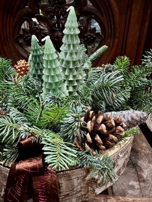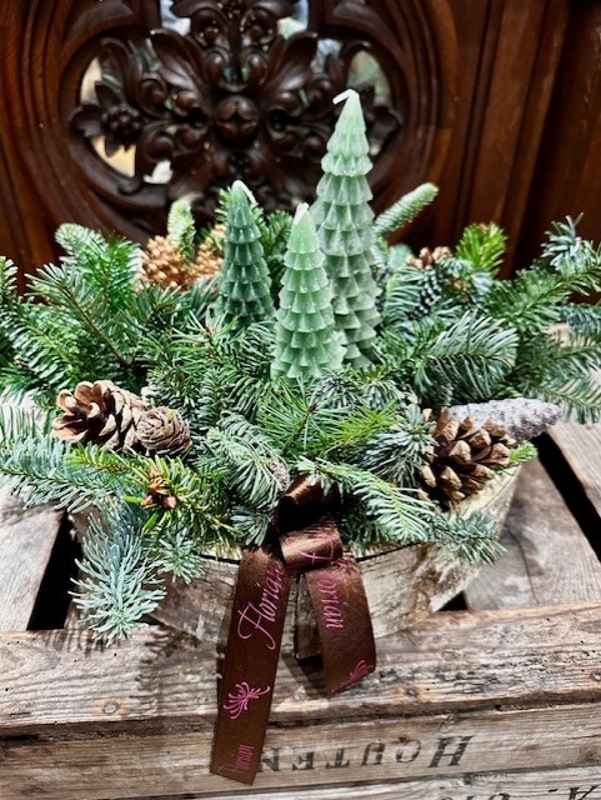 A beautiful design, perfect as a gift or for your own home for the festive season. A bark circular piece full of fragrant natural spruce, cones with three tree candles in the centre of the large and two in the standard size.. Standard size is 26cm diameter and the large size is 32cm .