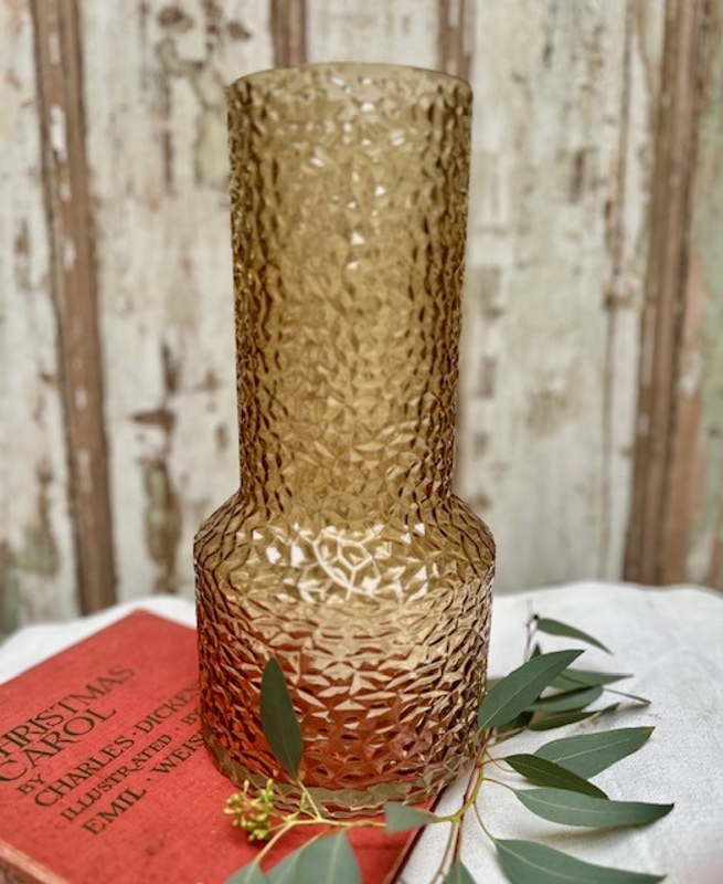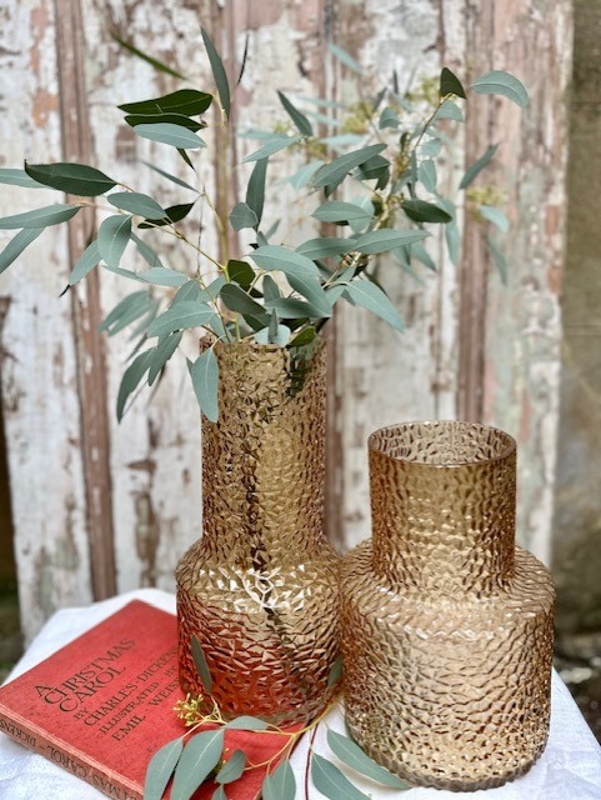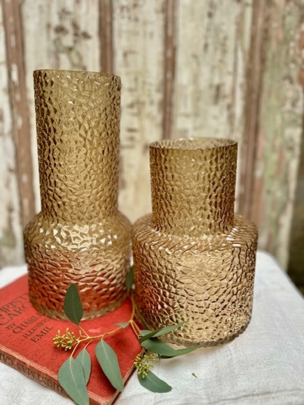 These lovely almost deco style textured glass vases are a nice weight so great to use. Small is 25 cm high and the larger is 32 cm high.