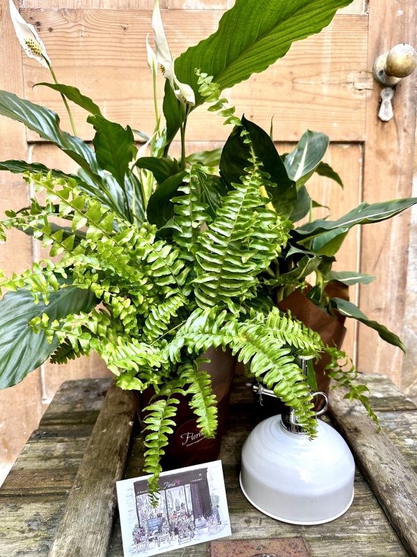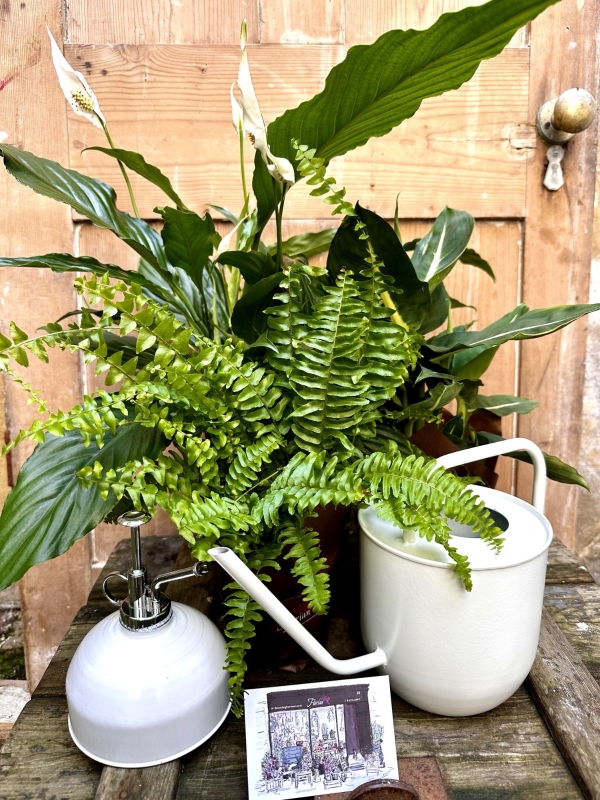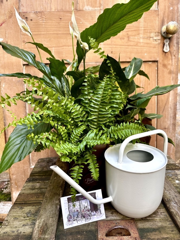 The full set , option 1 comprises of three easy care houseplants, with a metal watering can and metal plant spritzer.